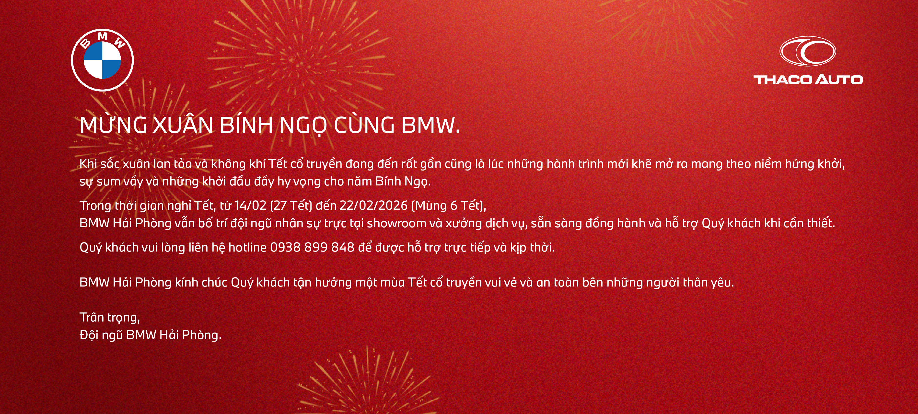 Trong thời gian nghỉ Tết, từ 14/02 (27 Tết) đến 22/02/2026 (Mùng 6 Tết), BMW Hải Phòng vẫn bố trí đội ngũ nhân sự trực tại showroom và xưởng dịch vụ, sẵn sàng đồng hành và hỗ trợ Quý khách khi cần thiết.